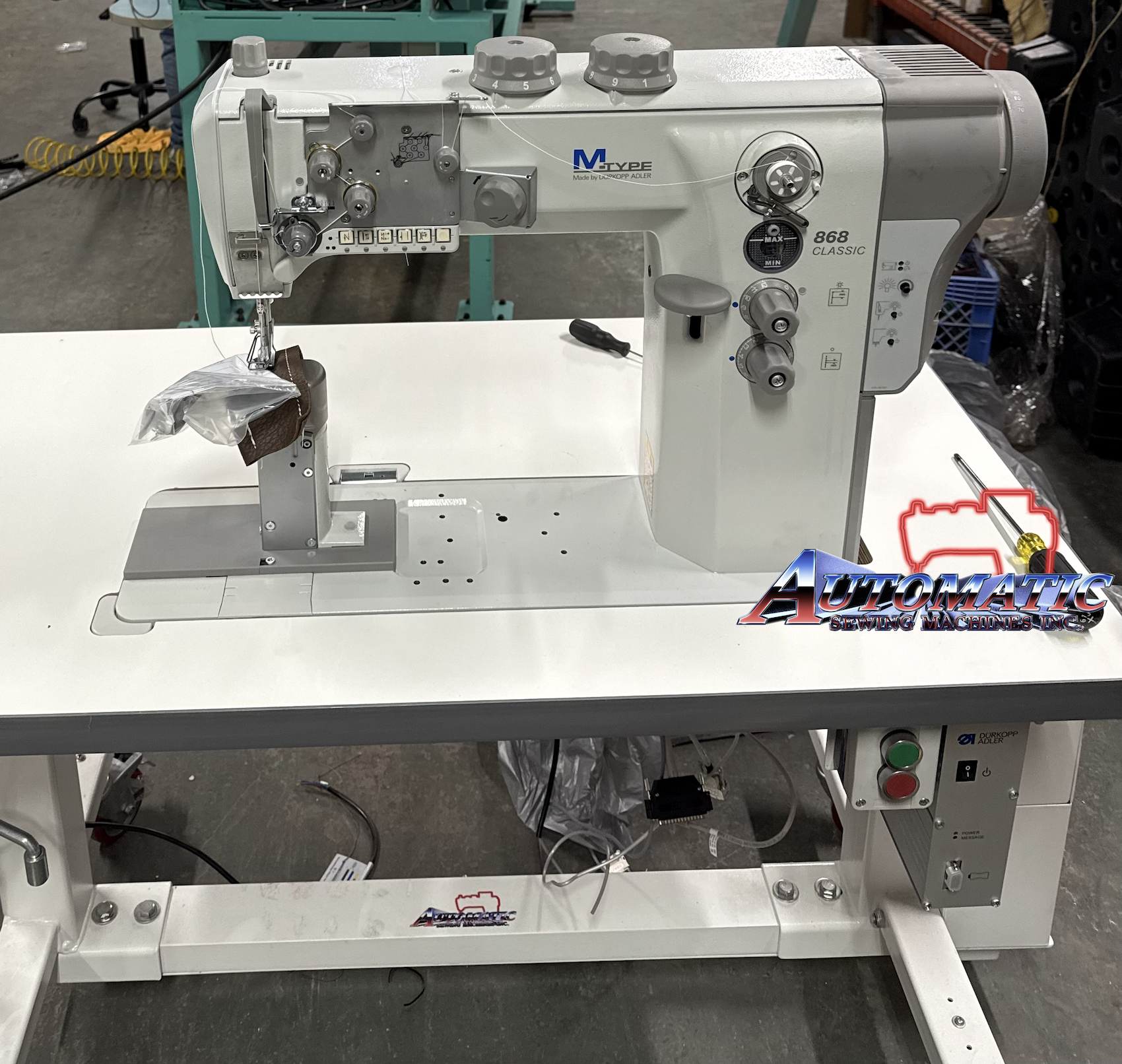 The Dürkopp Adler 868-M is a heavy-duty post-bed sewing machine built for upholstery, automotive interiors, leather goods, and other three-dimensional or bulky materials. With its triple-feed system, high foot lift, and ability to handle thick threads and long stitch lengths, it delivers stable, precise seams ideal for decorative and structural stitching.
